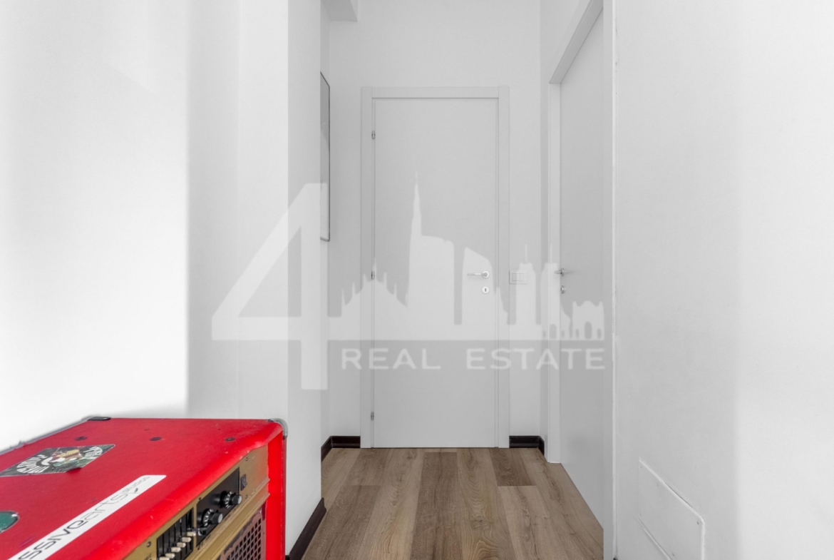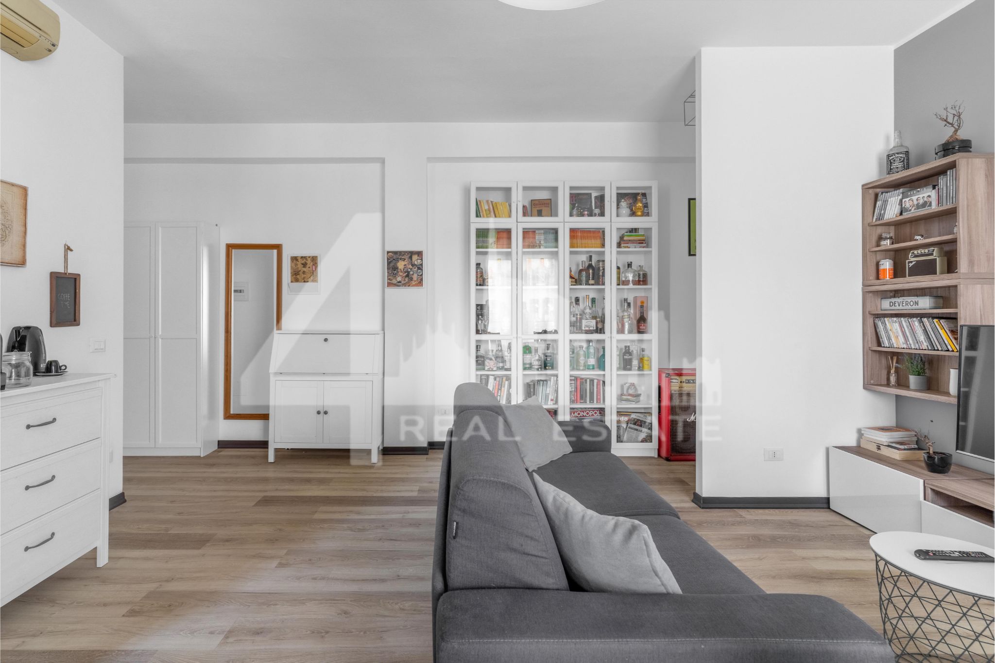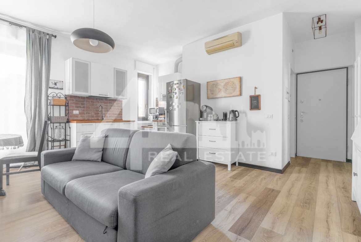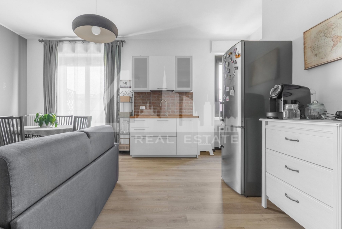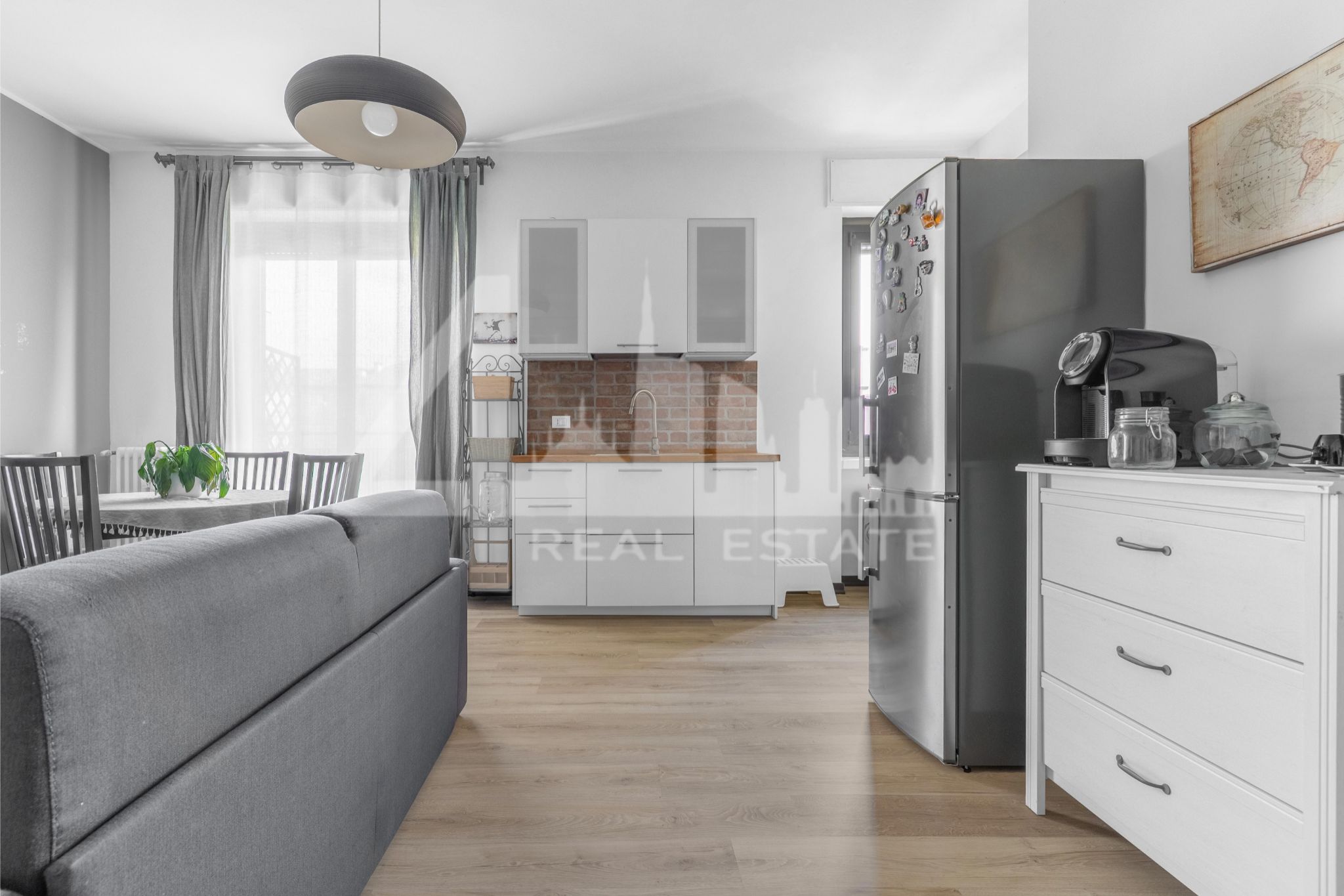 L’appartamento si apre su una luminosa zona living con cucina a vista, dalla quale si accede a un piacevole balcone con affaccio interno, silenzioso e riservato.