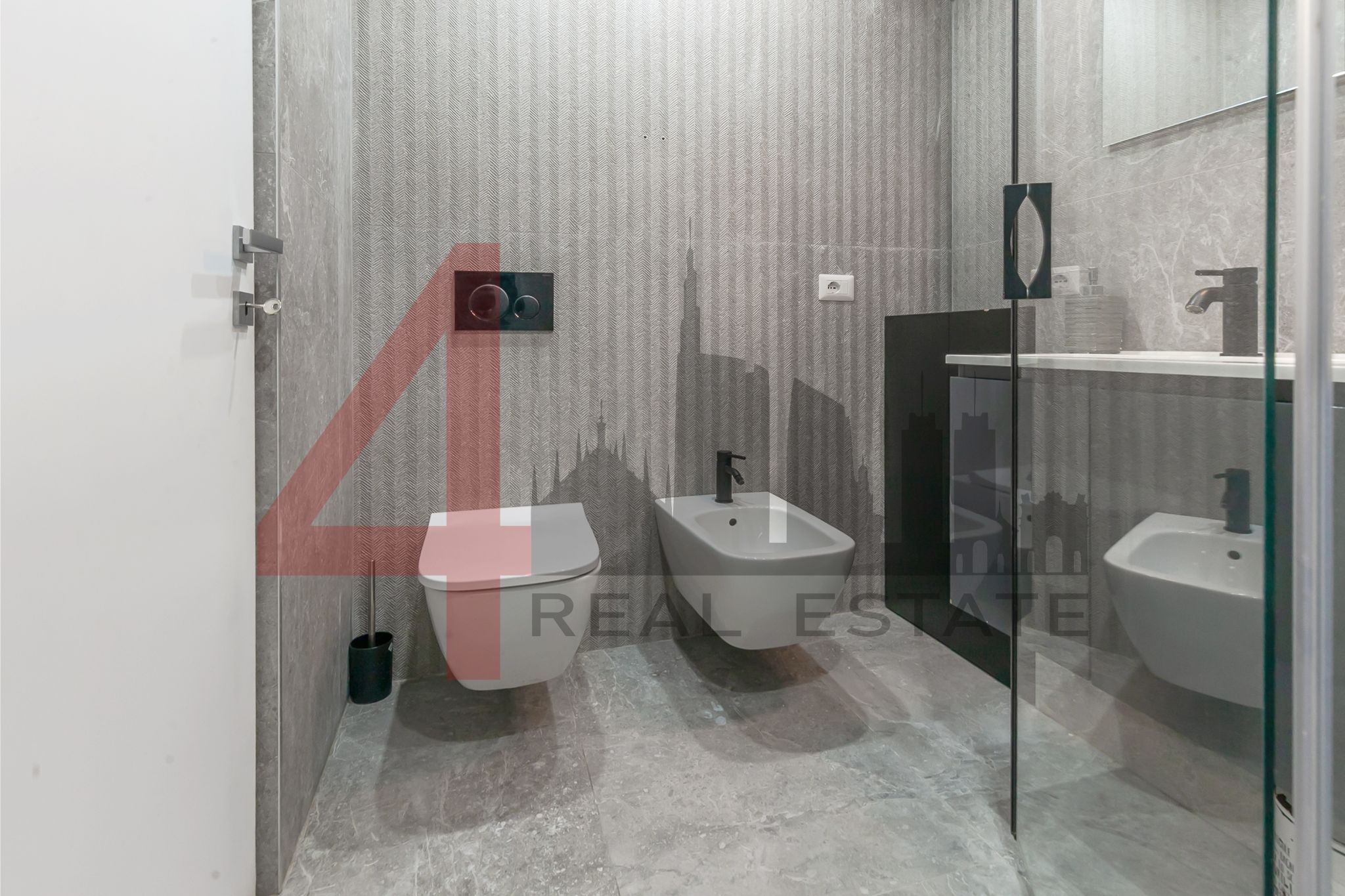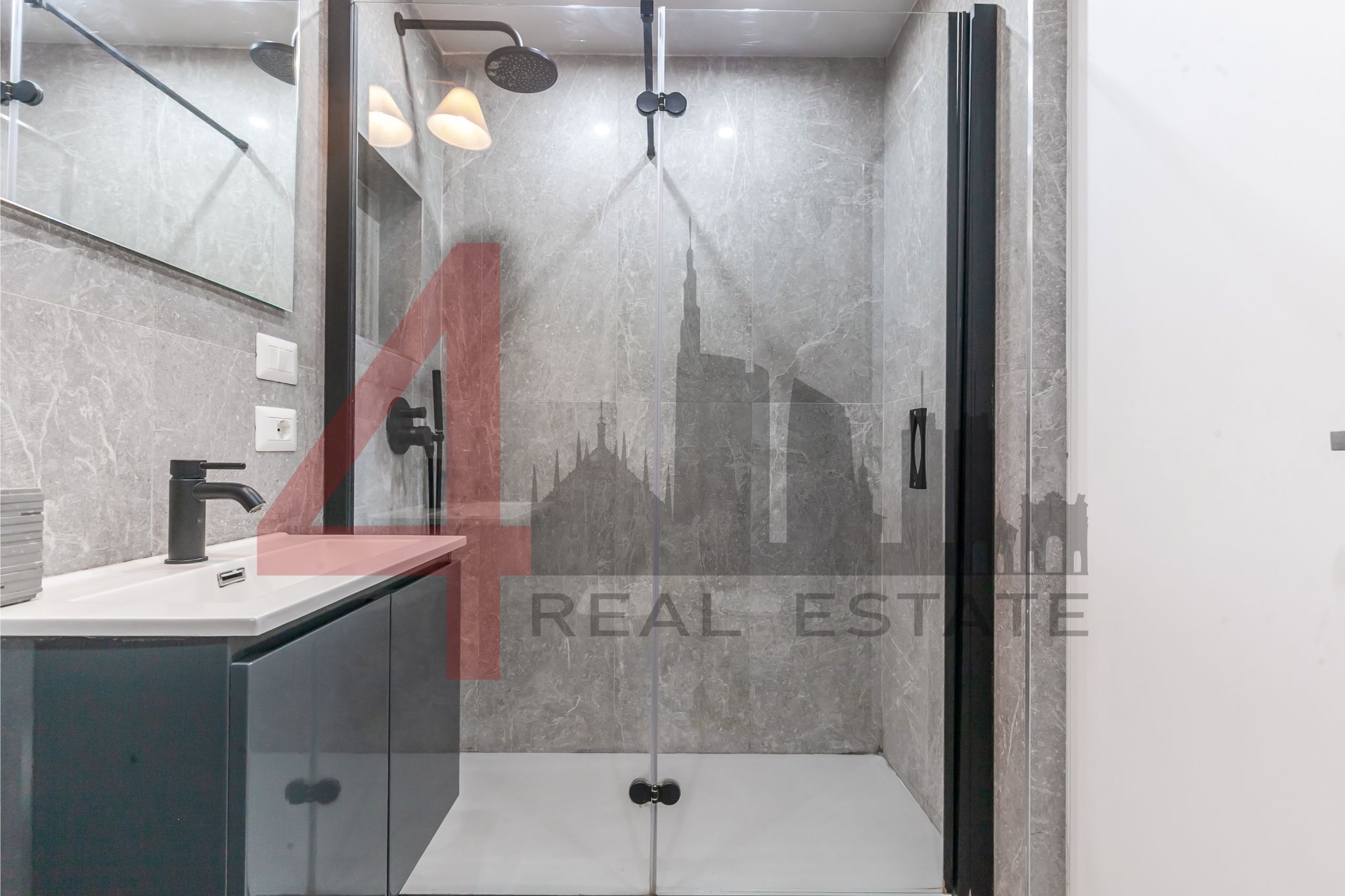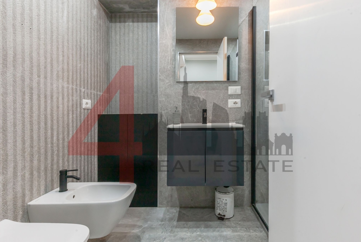 Il bagno, ristrutturato con gusto contemporaneo, presenta linee pulite e materiali di qualità.
