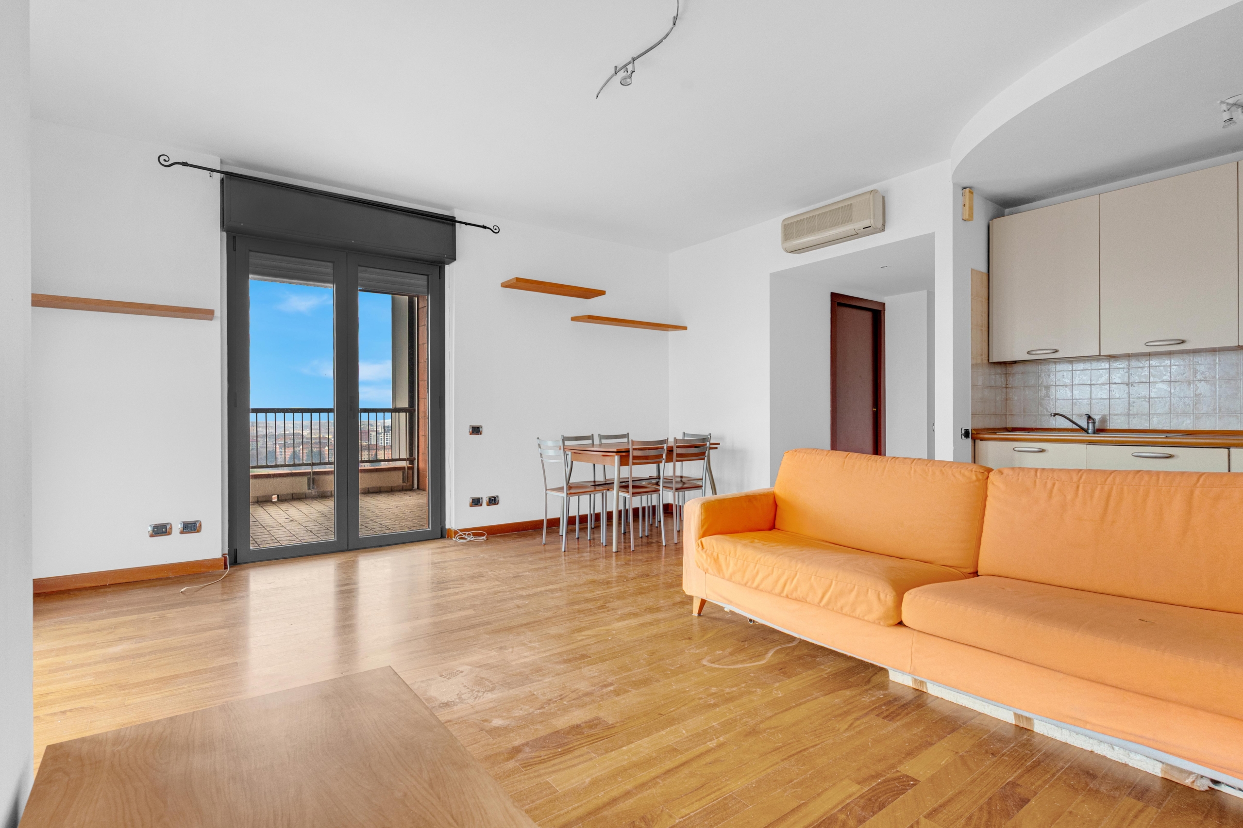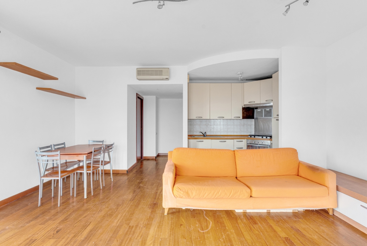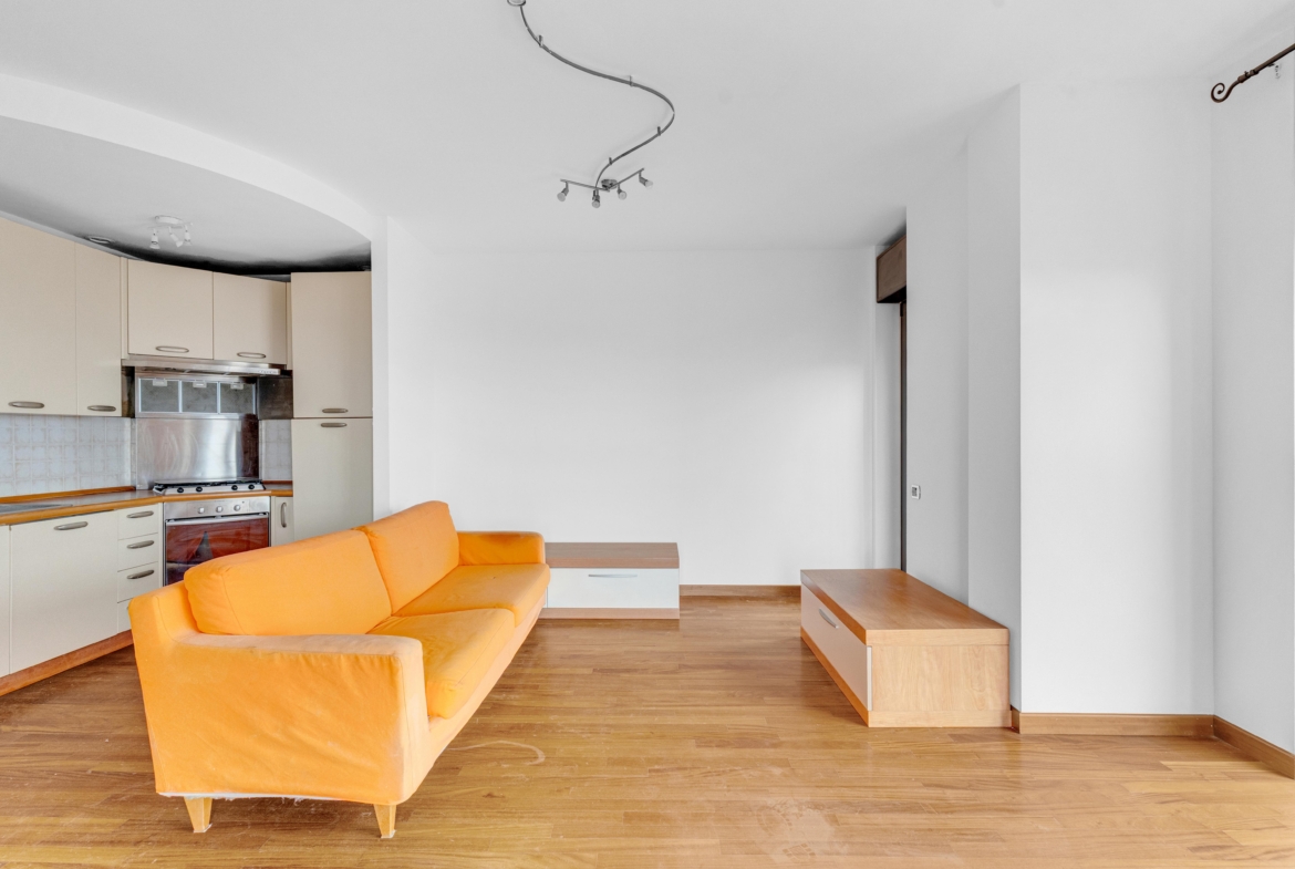 L’immobile si apre su un comodo ingresso che conduce ad un ampio living con cucina a vista e accesso all’ ampio terrazzo, uno spazio luminoso e accogliente ideale per momenti di relax o per creare un elegante angolo verde con vista sulla città.