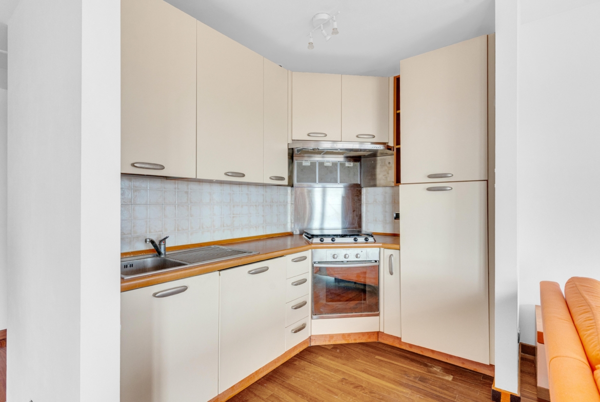 La cucina è ben organizzata e funzionale, perfettamente integrata nella zona giorno con accesso diretto al balcone.