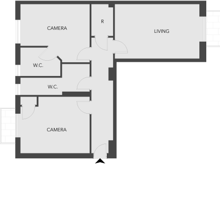 La disposizione attuale prevede soggiorno con cucina separata, due camere, doppi servizi e un comodo ripostiglio,con ottime possibilità di redistribuzione interna.