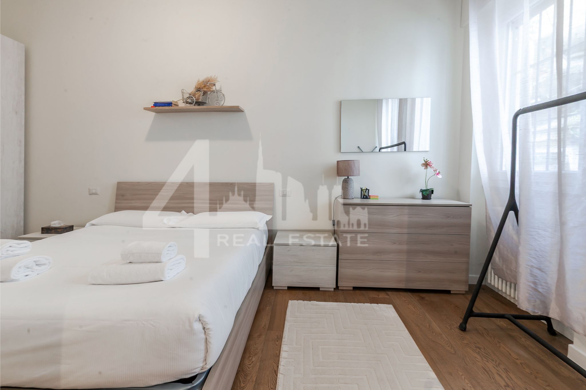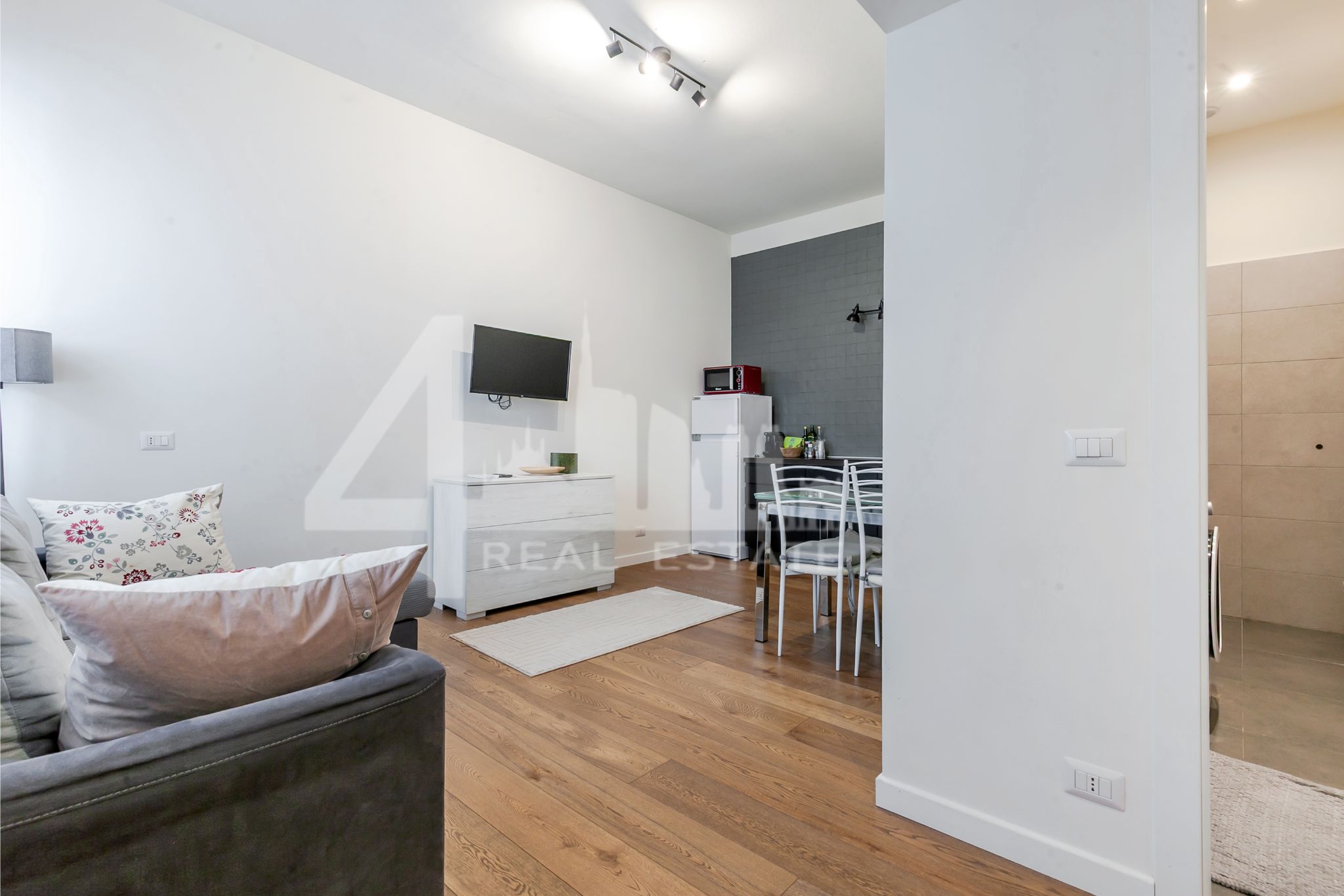 L’appartamento si apre su una luminosa zona living con cucina a vista con affaccio interno, silenzioso e riservato.