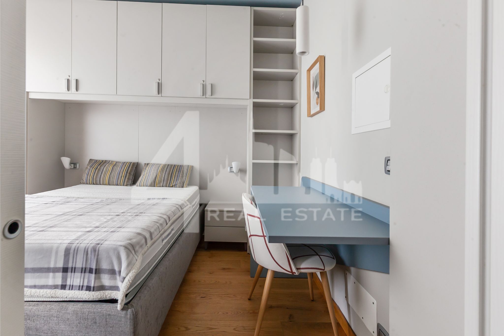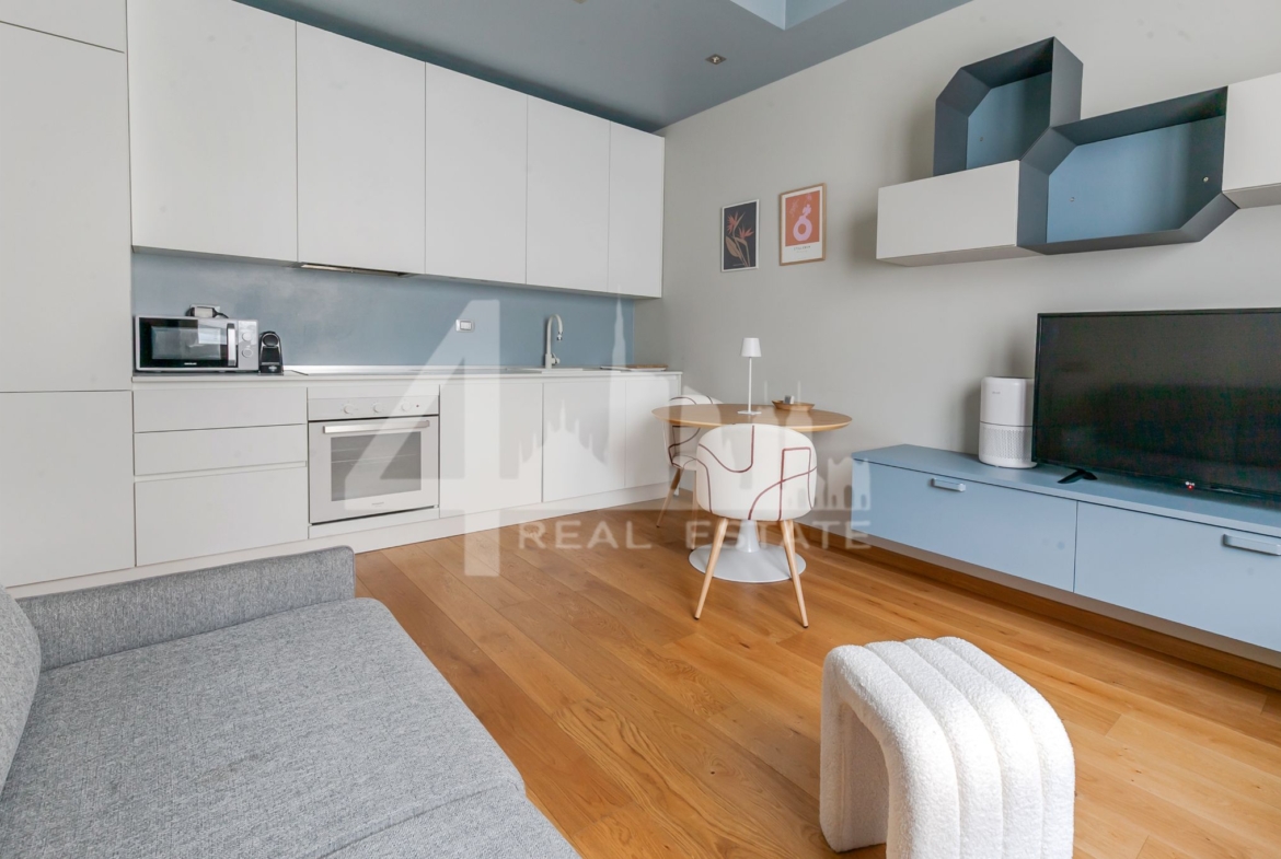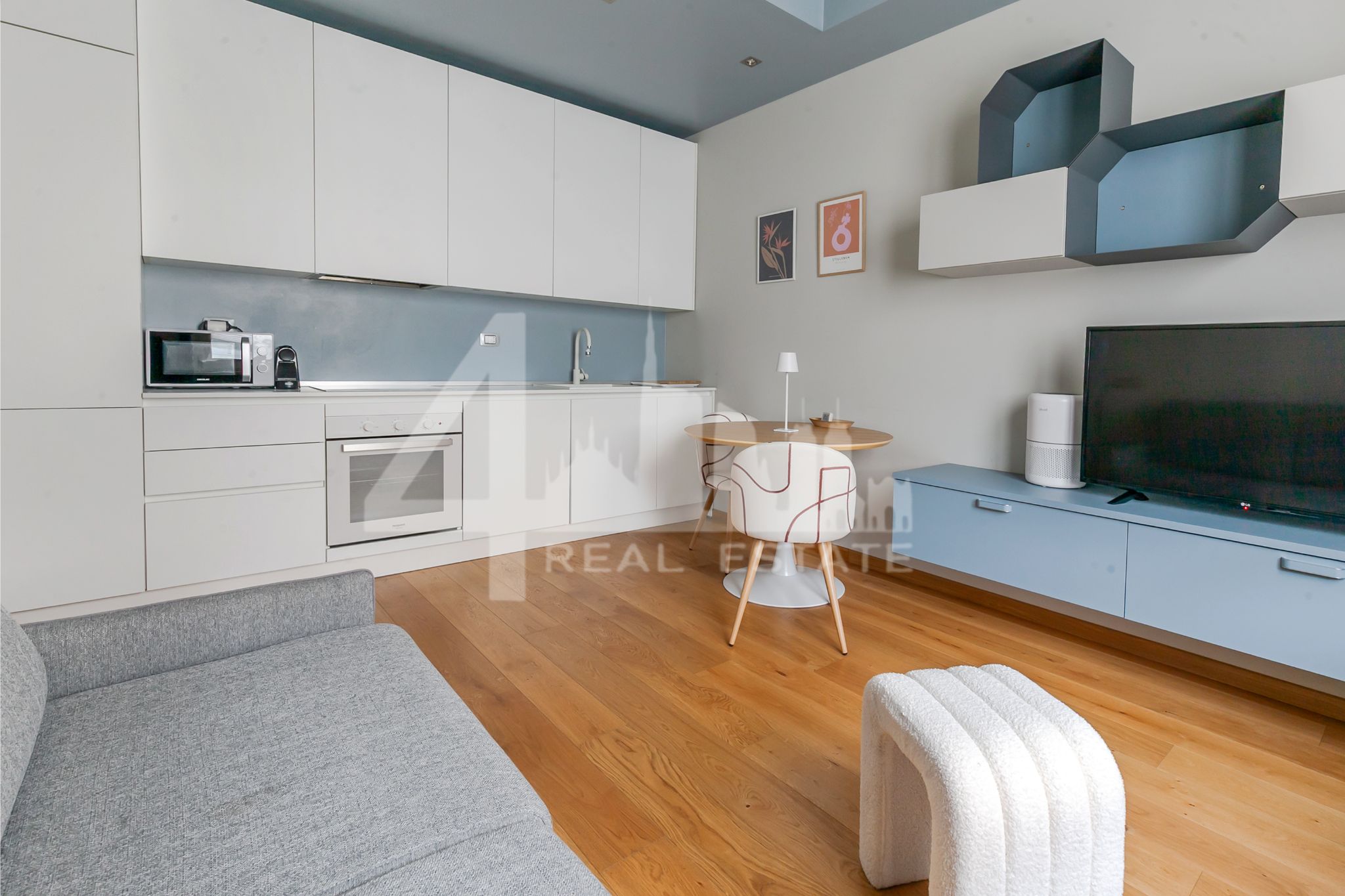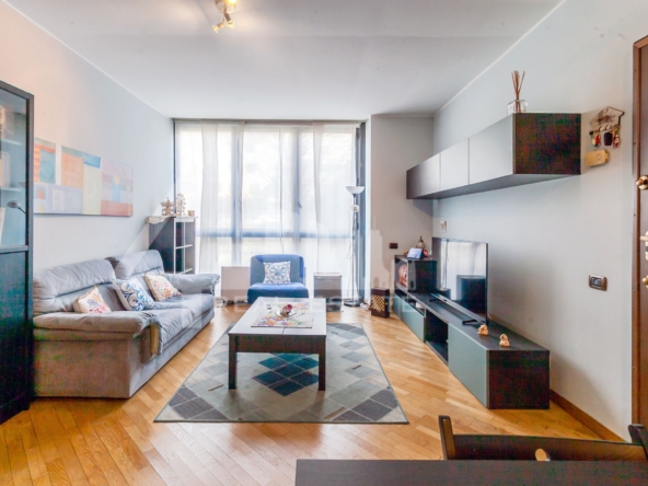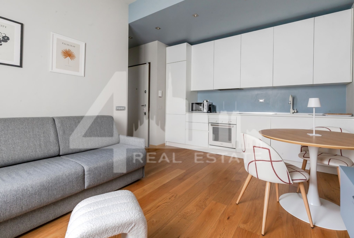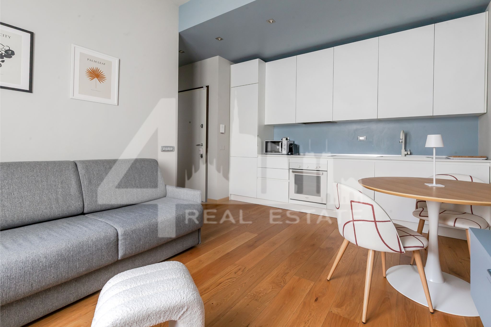 L’ingresso si apre su un elegante soggiorno con cucina a vista, accogliente e armonioso, impreziosito da arredi moderni e finiture di qualità.