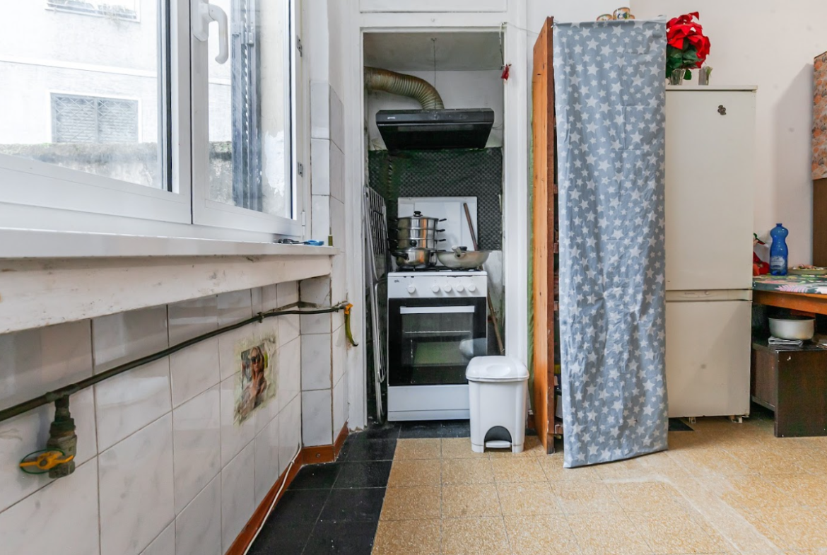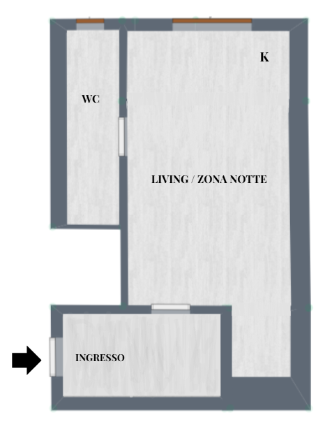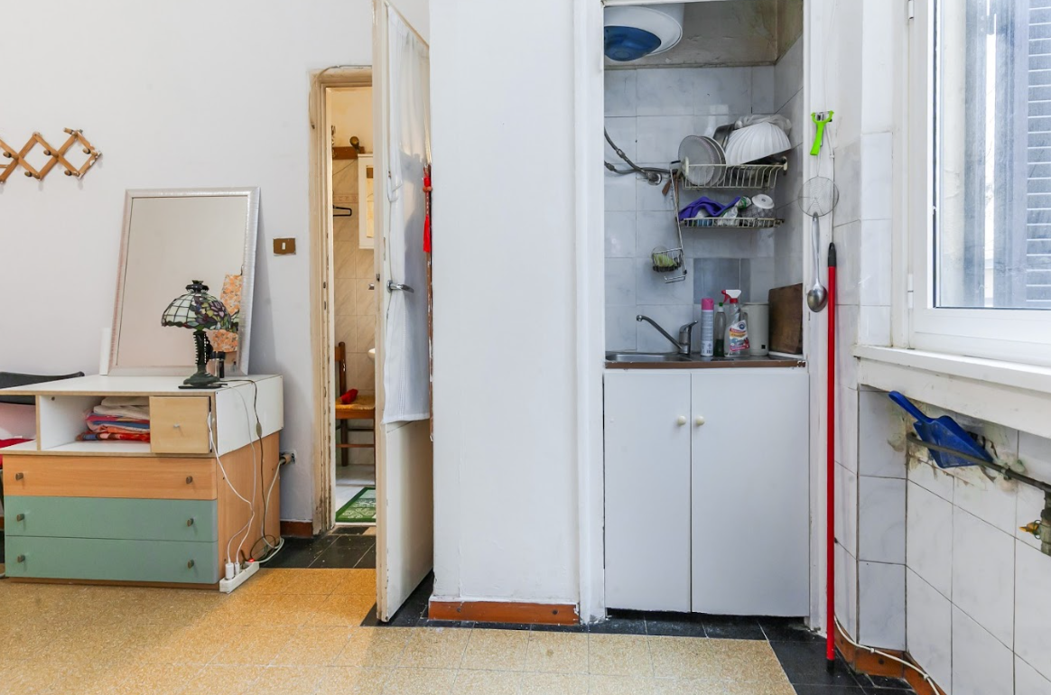 L’appartamento, da personalizzare, si apre su un ingresso accogliente che accompagna verso la grande zona giorno/notte da cui si accede al cucinotto e al bagno finestrato.
